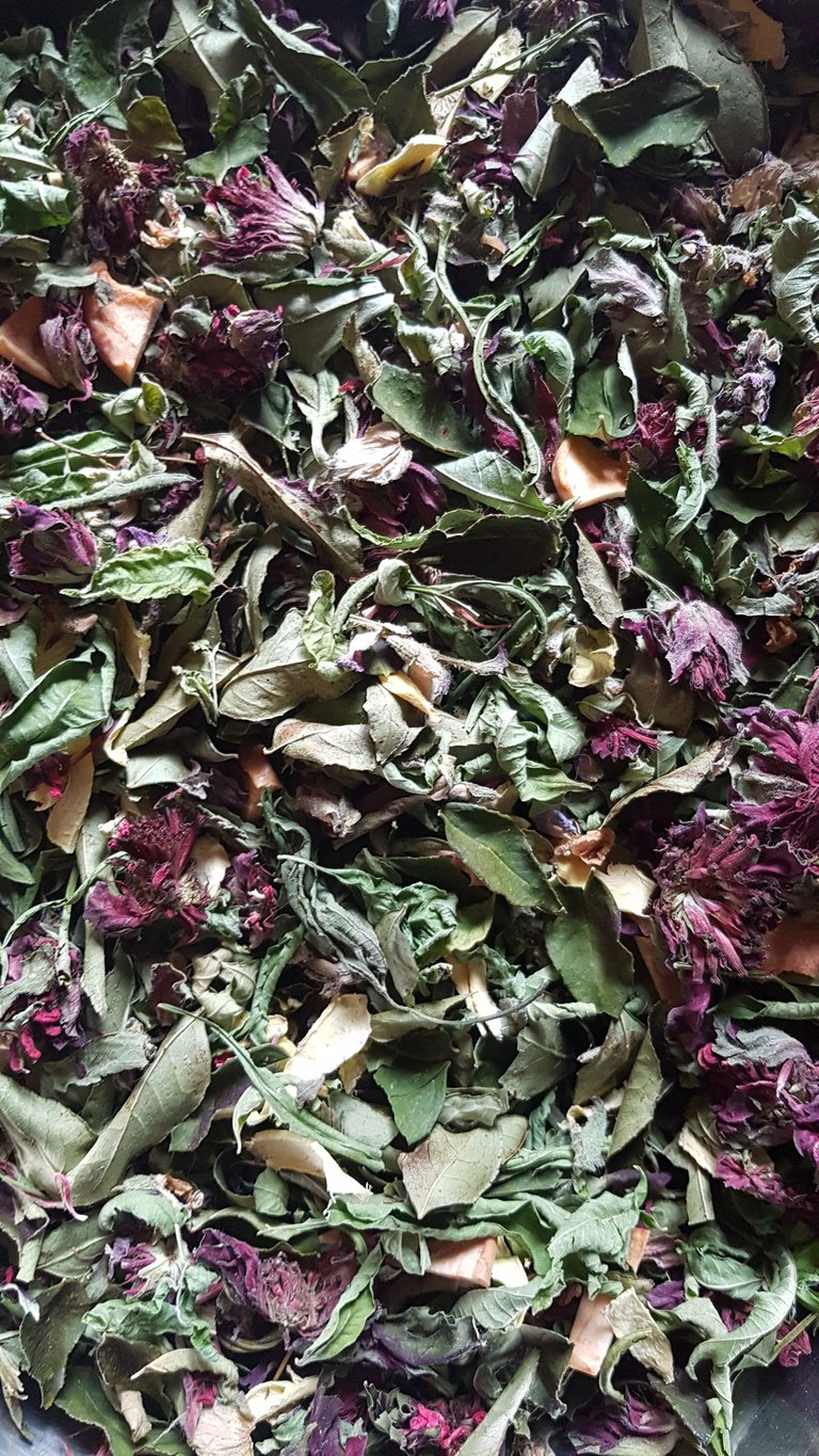 Monarde rouge, sauge slcarée, pomme, gingembre, poivrier de Sichuan, verveine, tagète